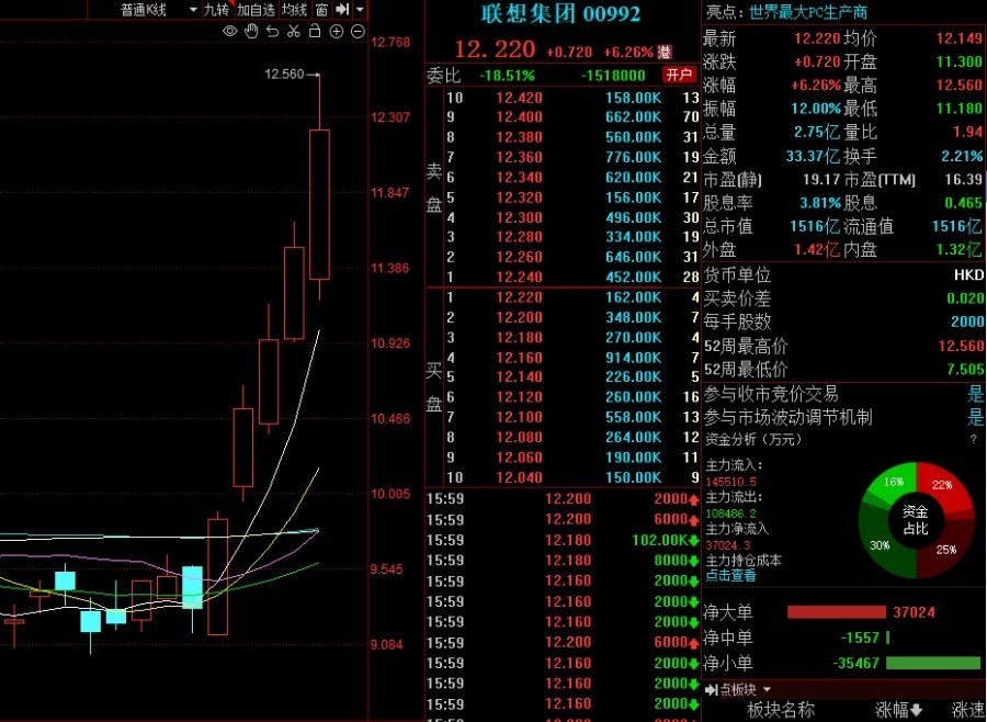 联想集团盘中涨超9%,收涨6.26%,报12.22港元/股,实现连续五个交易日上涨,据统计,其股价累计涨幅超30%。