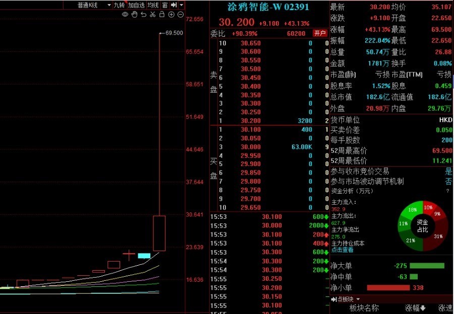 2月7日开盘,港股涂鸦智能-W(02391.HK)股价高开高走,午后出现直线拉升,涨幅一度扩大至229.38%。截至收盘,涂鸦智能-W股价涨43.13%,总市值182.6亿港元。